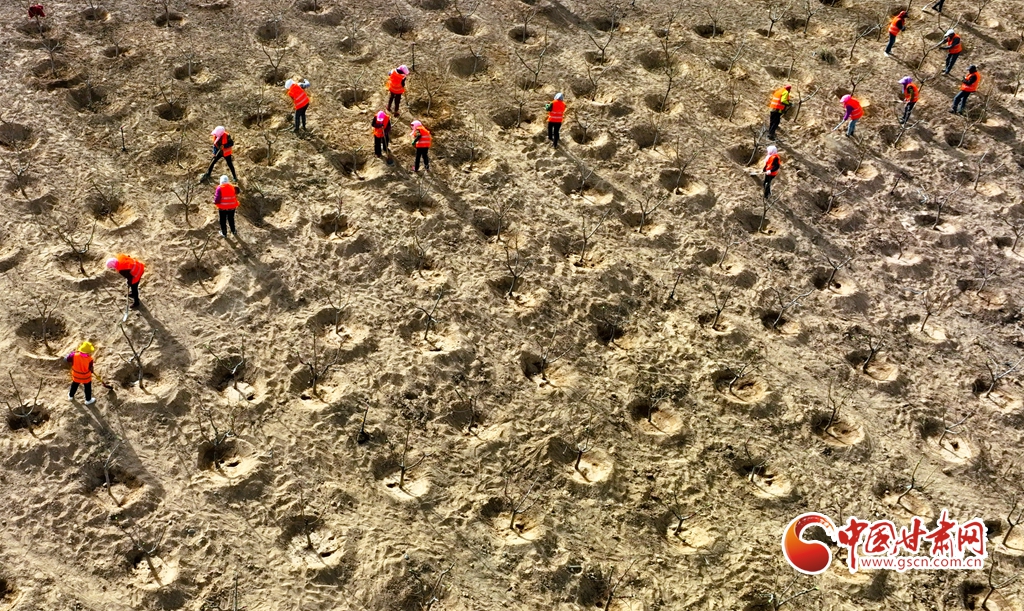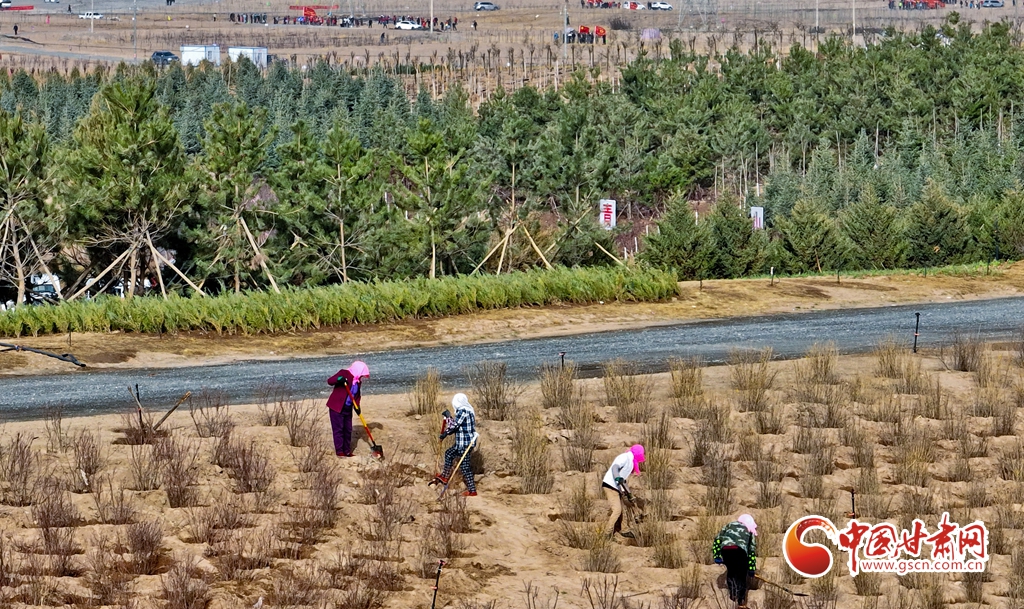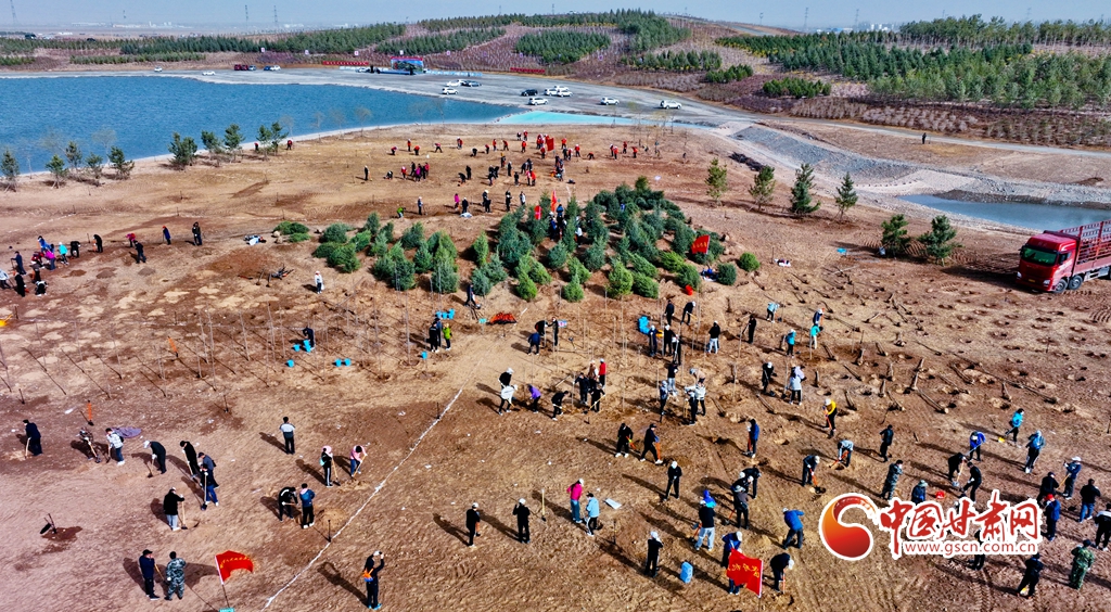 4月11日,在甘肅省張掖市甘州區黑河西岸黑河灘彩虹林海生態造林示范區內,眾多干部職工正在植樹。