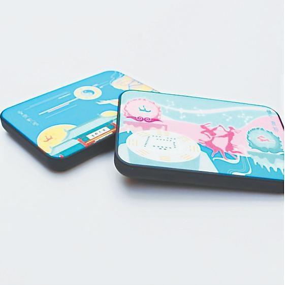 圖案來源于伏羲女媧因分別從山頂推下的兩磨盤緊緊結(jié)合的現(xiàn)象驗證了上蒼意圖,決定繁衍后代的傳說。火鳥騰飛之日與玉兔奔騰之月隔著天河星辰分懸兩邊,繪有河圖的磨盤見證生命的起源,雙人自由舞動的身軀揚起歡騰的節(jié)律,完美契合于陰陽諧振的樂音。美好寓意的組合充溢起整個載體,令人傾心又矚目于彩色流韻的真景里。