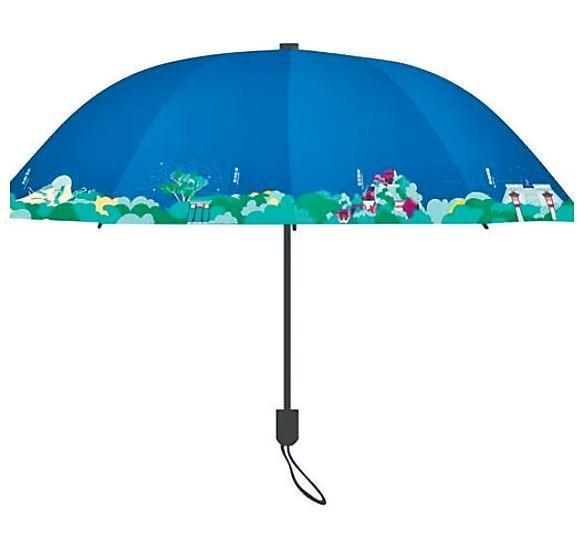 畫面是對天水文化的整合轉(zhuǎn)譯。靜謐的深藍(lán)夜色宛如舒緩溫柔的吟唱,點醒具有暗語的想象。連綿起伏的綠影又將目不暇接的八美之景串聯(lián)起墜于傘邊沿,呈現(xiàn)一種清新淡雅的格調(diào)。四字榜題作為光影與畫面間的調(diào)和劑潤化了視覺美感,使空間溢滿文人逸趣。簡潔平穩(wěn)的畫卷里隱含古雅山水的形象,靈動漂浮的畫卷里創(chuàng)立起意蘊美學(xué)。