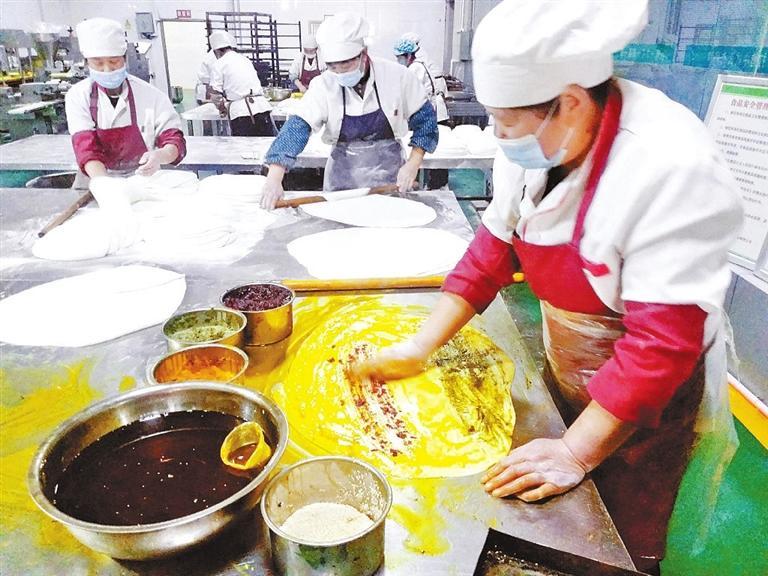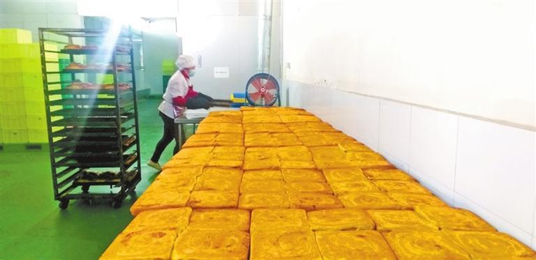 “揉面、搟面、抹餡料……”手工制作線上一位大姐告訴記者:“目前我們有手工生產和全自動生產兩條線,分別生產千層餅傳統面點和玫瑰餅等新型糕點。傳承祖上燒餅制作技藝,工人們要在前一晚和好面,面團經過一夜的醒發后,天剛亮再交由經驗老到的師傅打堿,揉面、搟面,涂抹苦水玫瑰醬、胡麻顆粒、香豆粉、姜黃粉等餡料,卷制成型,在千層餅正面撒上芝麻,就可以上烤箱了,大約每天上午10點前烘烤好的千層餅會送往永登各銷售點。”