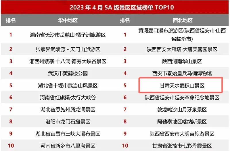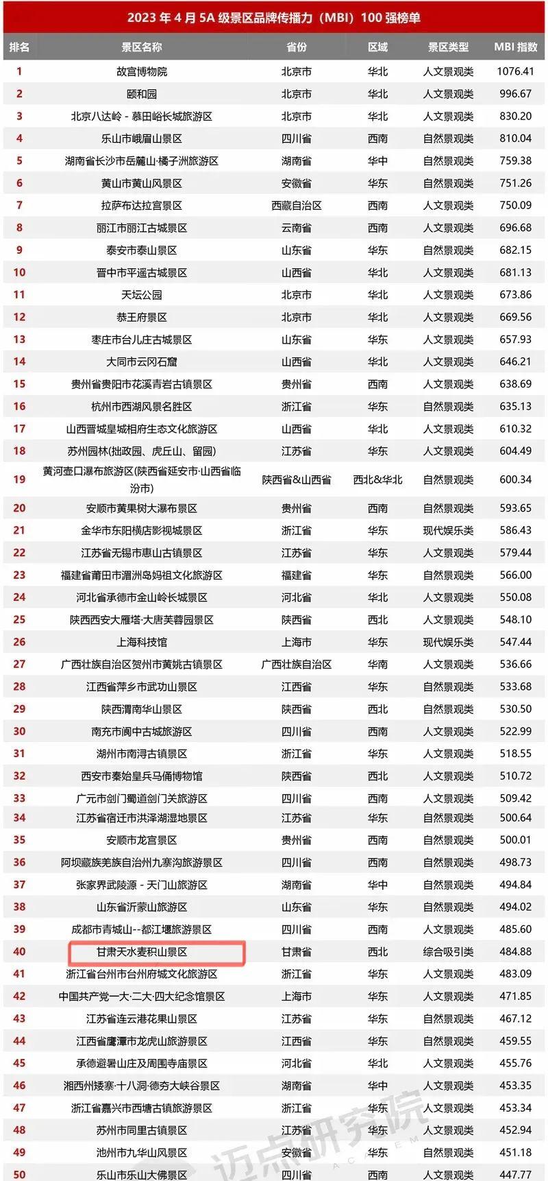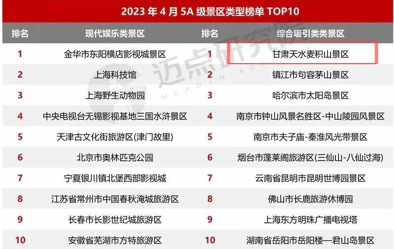2023年4月5A級景區品牌傳播力100強榜單上,熱烈祝賀麥積山景區榮登國內文旅行業最具影響力的權威數據分析機構“邁點研究院”4月5A級旅游景區品牌傳播力百強榜單前五十和綜合類旅游景區第一、西北地區分項榜單第五。