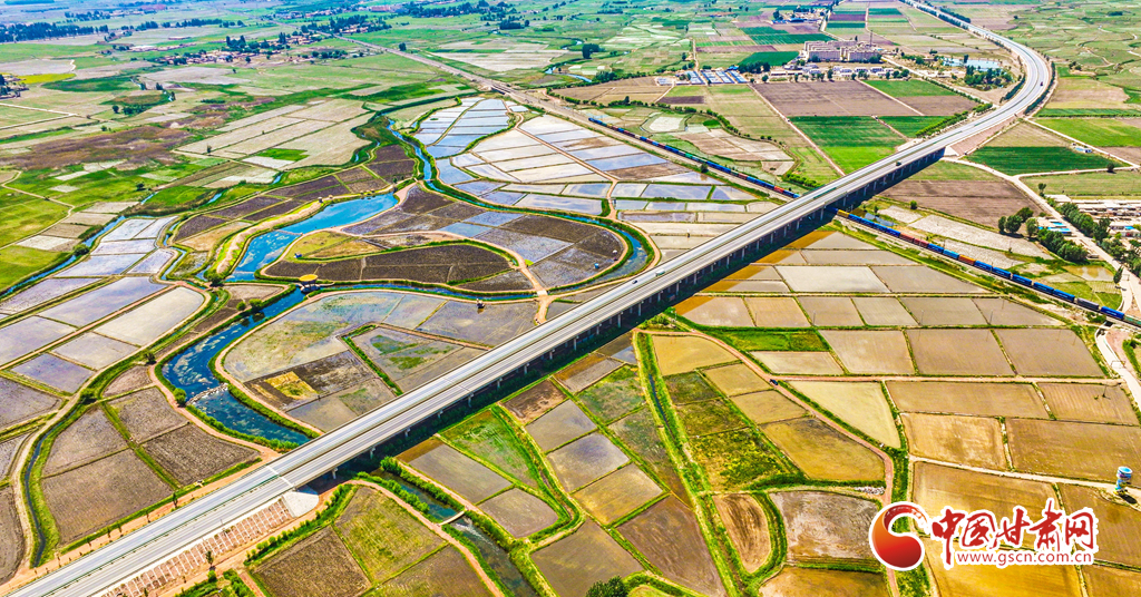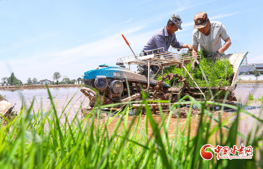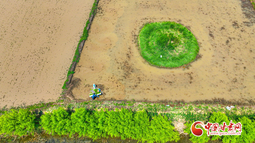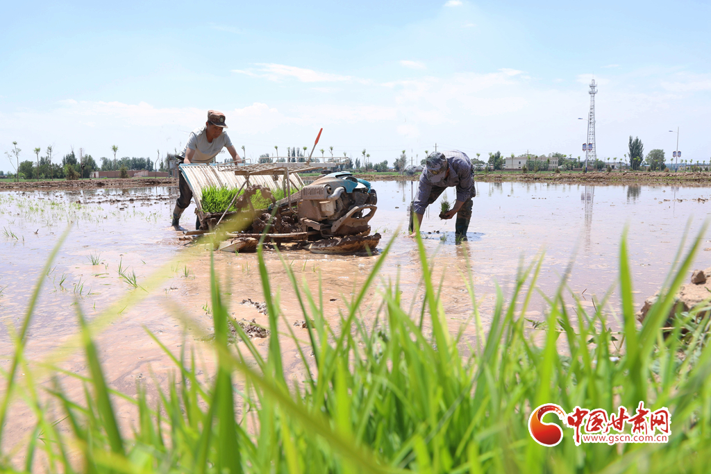 6月5日,祁連山北麓,甘肅省張掖市甘州區烏江鎮、靖安鄉的稻田里,插秧機同農戶來回穿梭插秧,2200多畝稻田進入了繁忙插播中。