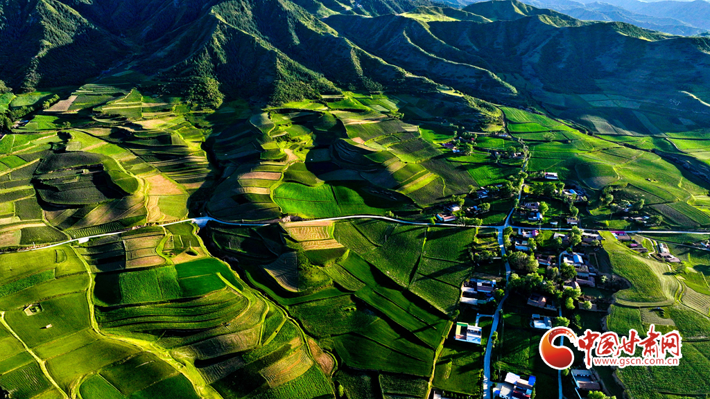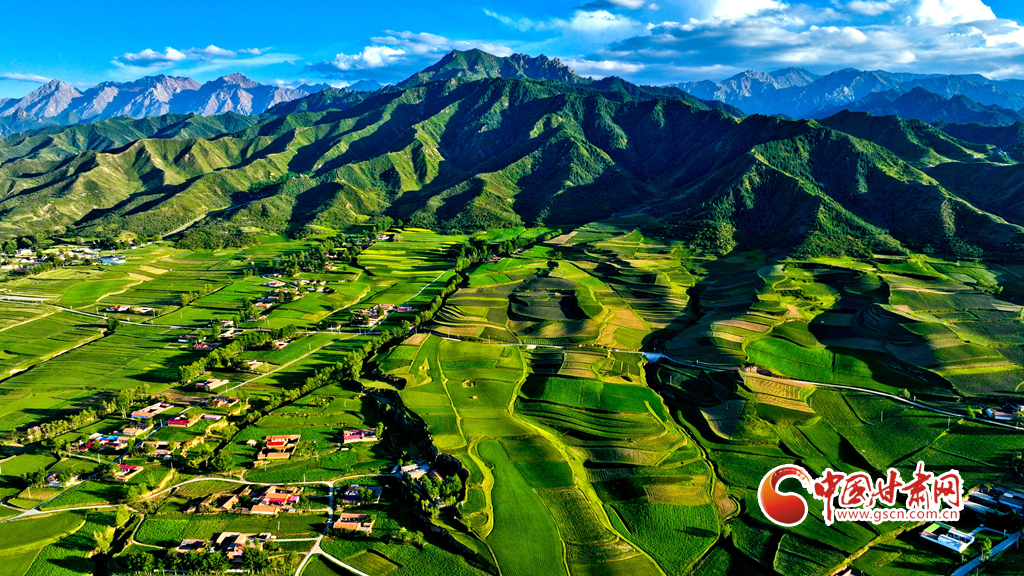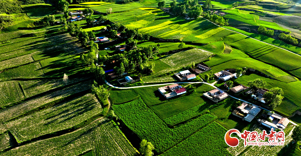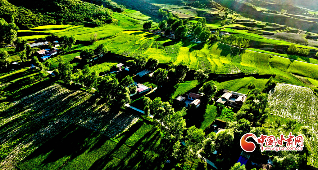 夕陽映襯下的祁連山北民樂縣豐樂鎮易家灣村,綠油油的莊稼生長旺盛,林木蓊郁層林盡翠,呈現出生機勃勃的景象,猶如“巨幅綠毯”。