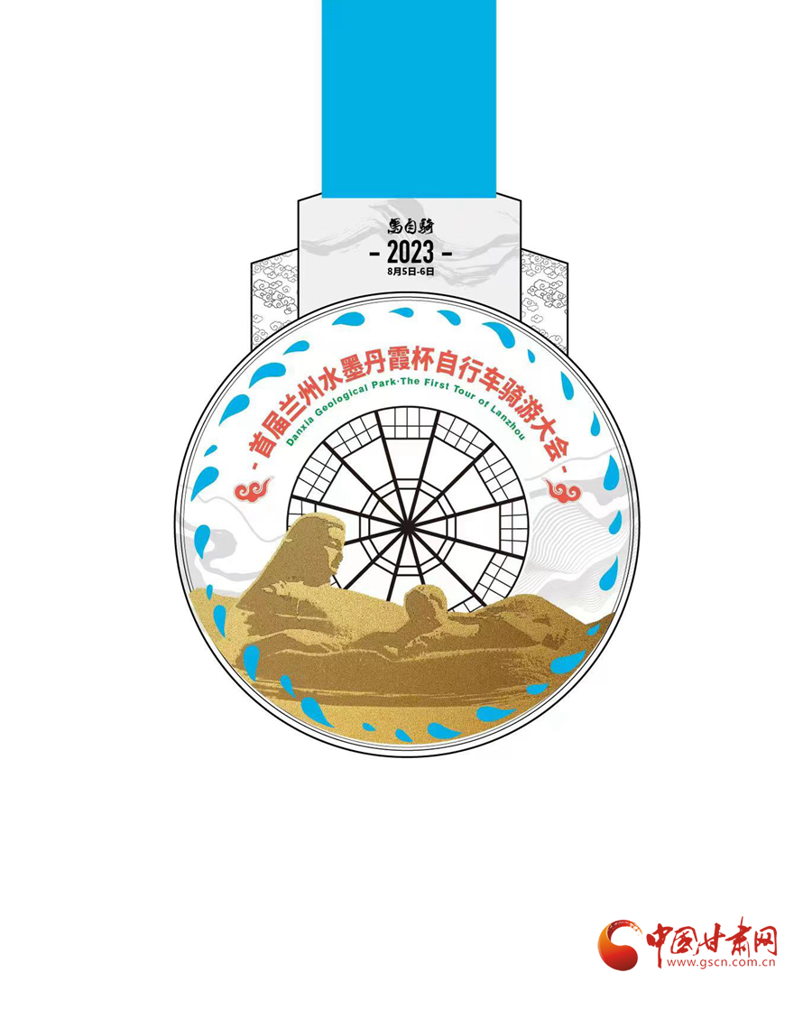 騎游大會獎牌設計突出黃河元素,正面“黃河水車”鏤空造型、“黃河母親塑像”元素,展現了蘭州母親黃河穿城而過的獨特地理特征。背面紋路采用黃河水紋,色彩上采用水墨丹霞的綠色與橙黃色,突出水墨丹霞騎游段線路特征。