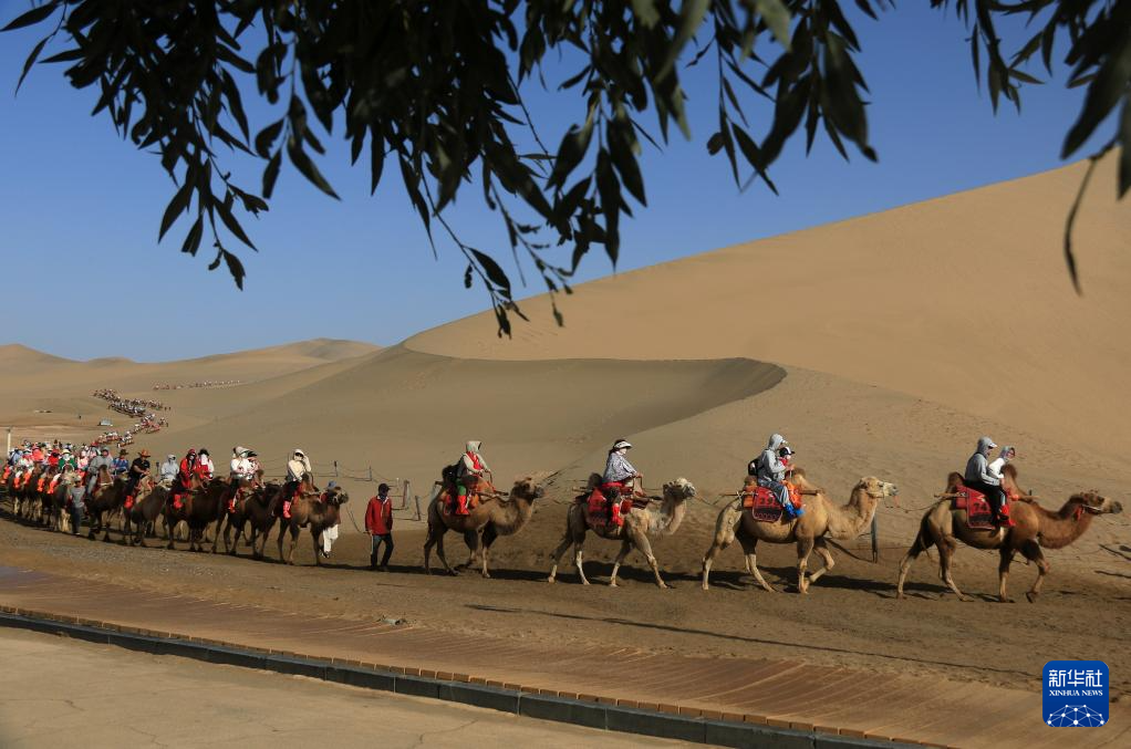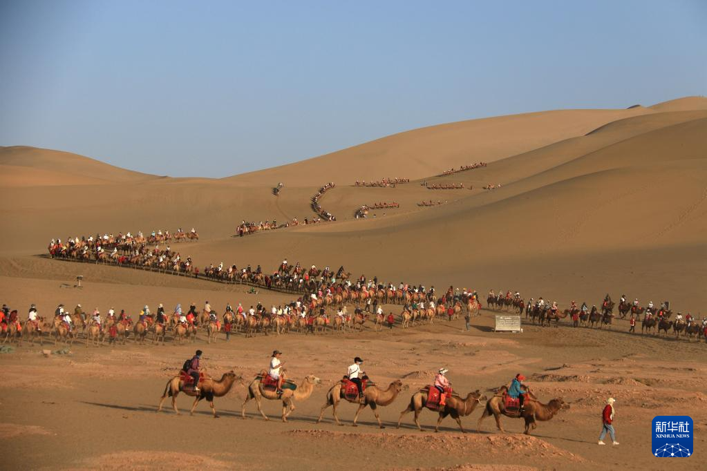 初秋時節,甘肅省敦煌市碧空如洗,鳴沙山月牙泉景區景色如畫,引人入勝。