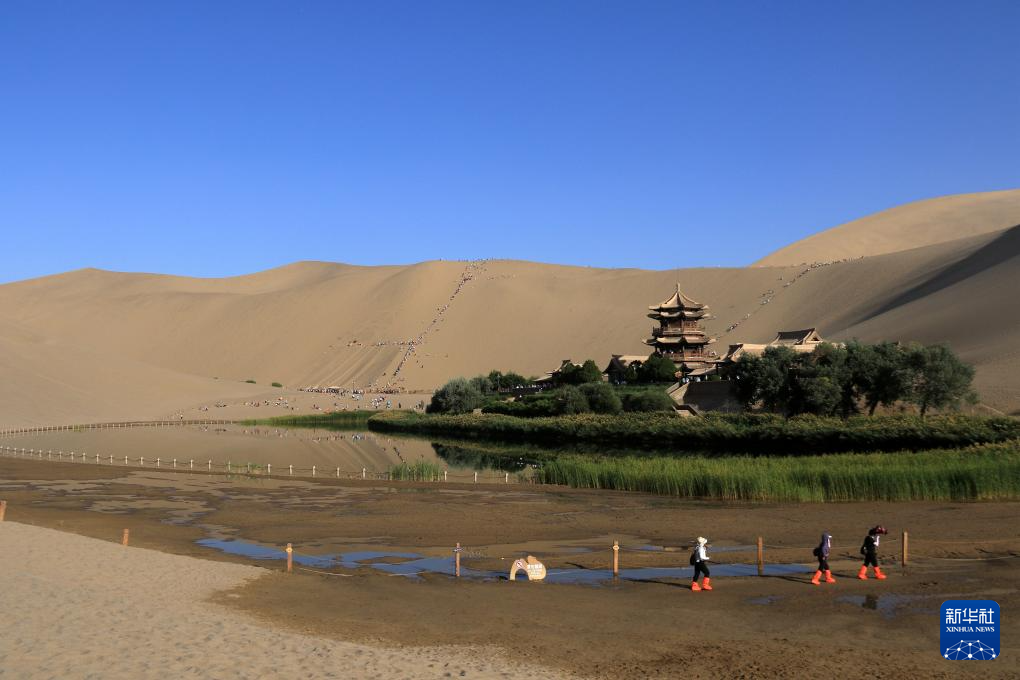 8月20日,游客在甘肅省敦煌市鳴沙山月牙泉景區游覽。新華社發(張曉亮攝)