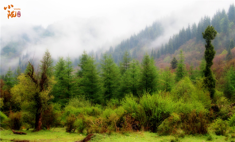 遠處,大霧彌漫,淹沒了群山,只露出些隱隱約約的輪廓。不知是什么時候,霧海中現出奔騰的雄獅、悠閑的駱駝、開屏的孔雀、沉睡的老虎……霧竟有如此神奇的力量,它豐富多彩,變幻莫測,是它給這群山增添了無窮的魅力;近處,芳草青碧,翠林如海,蒼黛凝重。