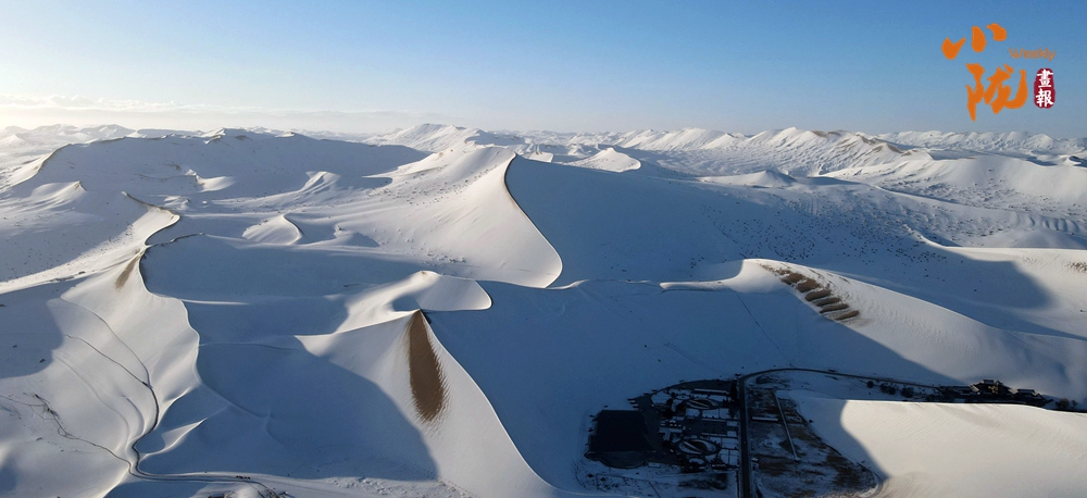 從空中俯瞰,漫漫沙漠覆蓋著白雪,月牙泉成了沙漠的眼睛,構成另一幅美麗的沙海畫卷。