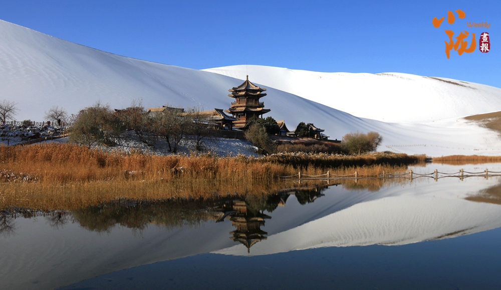敦煌下雪之后,一半沙漠一半雪。冬日暖陽下,月牙泉像一面鏡子,將沙漠映照得更為浪漫,讓人產生無限遐想。