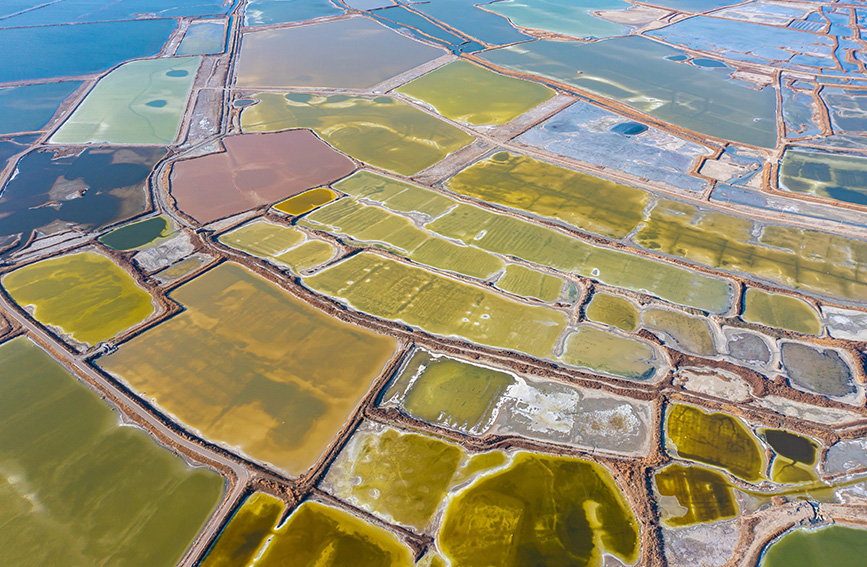 冬日時節,隨著氣溫降低,山西運城鹽湖湖面上,色彩斑斕、景色如畫。芒硝結晶,“硝花”似雪,鹽湖里各種線條和幾何圖案,猶如大自然的調色盤,十分迷人。