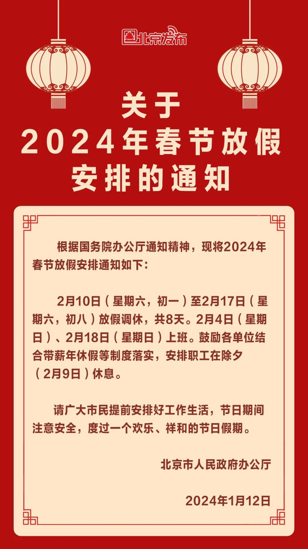 1月12日,北京市人民政府辦公廳正式發布關于2024年春節放假安排的通知。通知稱,2月10日(星期六,初一)至2月17日(星期六,初八)放假調休,共8天。2月4日(星期日)、2月18日(星期日)上班。