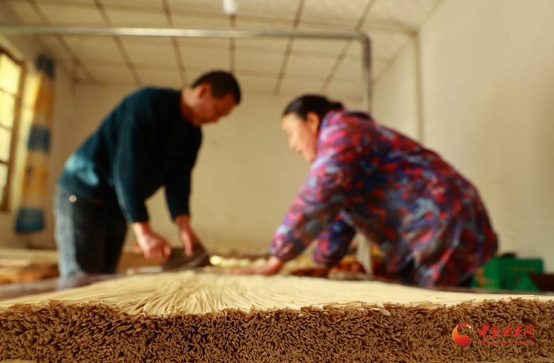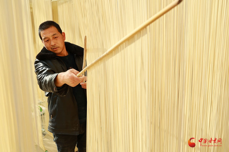 近日,在甘肅省隴南市康縣周家壩鎮周家壩村,村民周珍珍家正在抓住晴好天氣制作傳統純手工掛面,供應年貨市場。