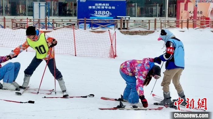 圖為滑雪教練協助臺胞青年進行滑雪訓練。王牧雨 攝