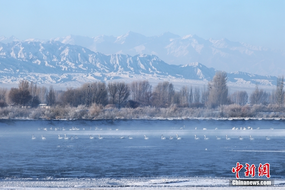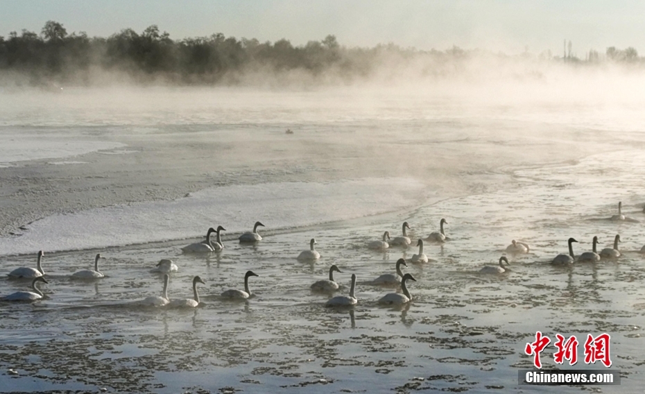 1月21日清晨,甘肅張掖市黑河國(guó)家級(jí)自然保護(hù)區(qū),受低溫影響,黑河水面霧氣氤氳縹緲,天鵝在水中暢游,野鴨等候鳥(niǎo)在空中飛舞,宛如一幅水墨生態(tài)畫(huà)卷。圖/CNSphoto 成 林 攝