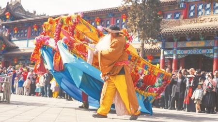 安定現龍山秧歌會在玉湖公園舞龍。 牛小棟 攝