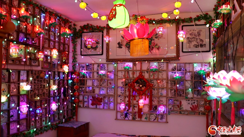 走進馬玉琳的家,精美的宮燈、雅致的荷花燈、喜慶的掛件、彩色的燈帶錯落有致地掛在木制格子架上,濃濃的年味兒撲面而來,數百盞彩色花燈同時點亮,將屋內裝扮成“滿房燈火迎新春”的喜慶景象。