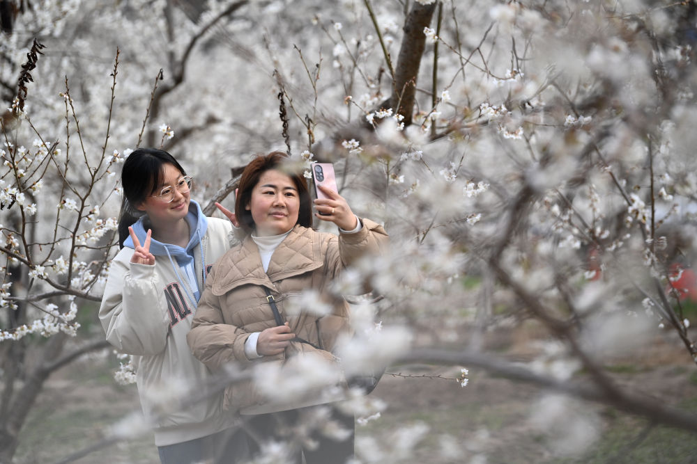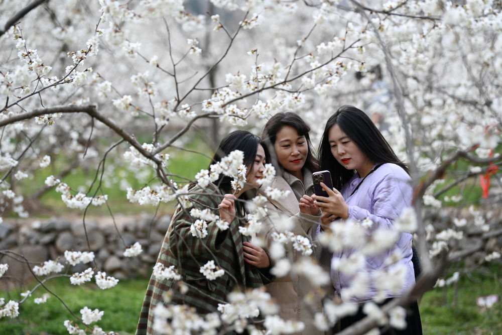 3月9日,兩名游客在隴南市武都區(qū)城關(guān)鎮(zhèn)石家莊村的櫻桃樹(shù)下拍照留念。新華社記者 陳斌 攝
