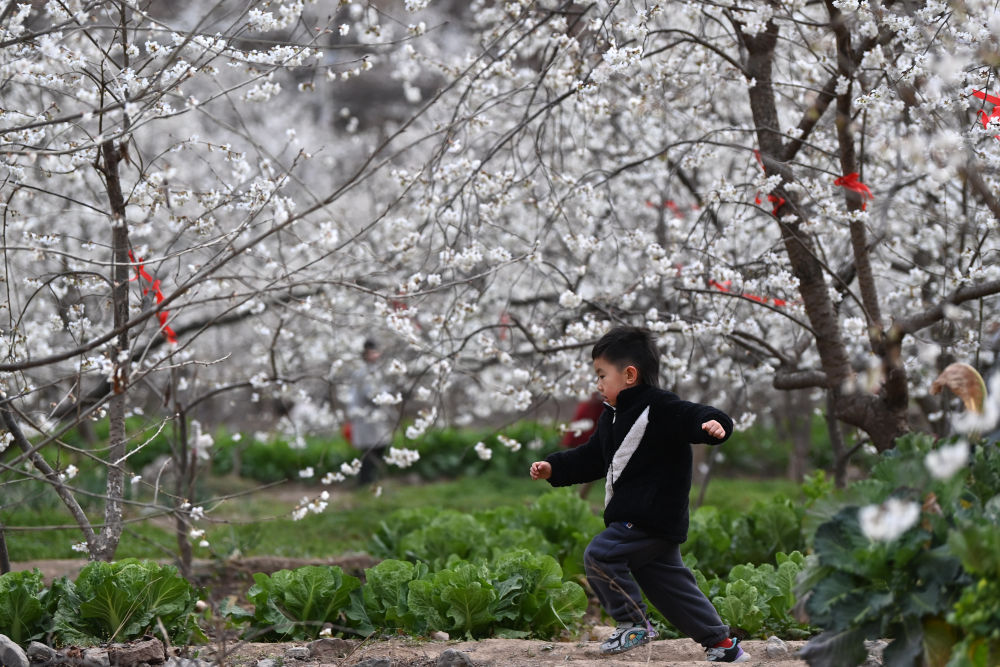 3月9日,一名小朋友在隴南市武都區(qū)城關(guān)鎮(zhèn)石家莊村的櫻桃樹(shù)下玩耍。新華社記者 陳斌 攝