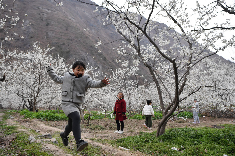 3月9日,幾名小朋友在隴南市武都區(qū)城關(guān)鎮(zhèn)石家莊村的櫻桃樹(shù)下玩耍。新華社記者 陳斌 攝