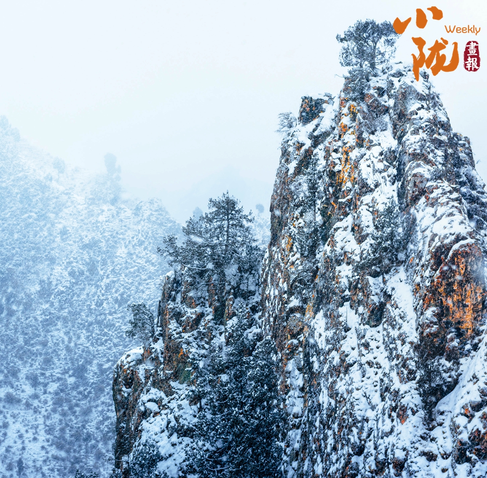 山巒草木都被純凈的白雪覆蓋,遠處的群山蒼蒼茫茫、異峰林立、斷崖高聳,與天相接,天地間輕霧彌漫,渾然一體,讓人心馳神往。