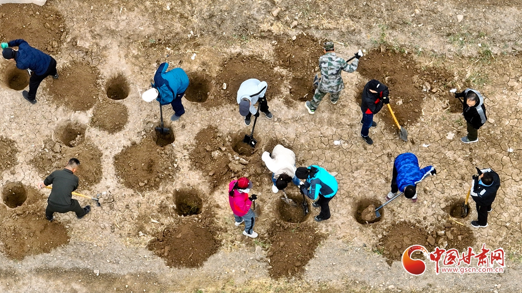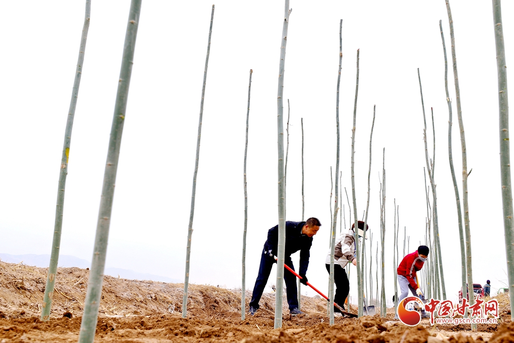 4月9日,甘肅省張掖市甘州區三閘鎮高寨村義務植樹基地上,千名當地干部職工和志愿者們揮鍬鏟土挖樹坑,掀起農田防護林建設和防沙治沙春季植樹造林熱潮。