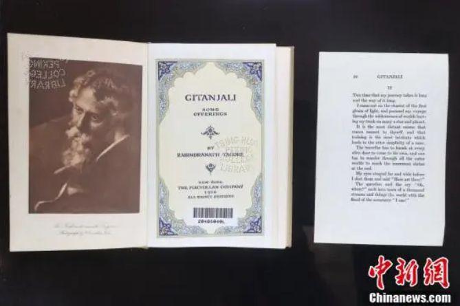 圖為清華大學圖書館收藏的紐約1916年英譯本泰戈爾詩集《吉檀迦利》。中新社記者 易海菲 攝