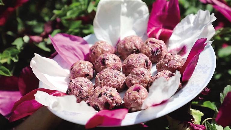 牡丹花肉丸,鮮香軟糯,做法不難。采摘新鮮的牡丹花,取花瓣用清水洗凈,選取肥瘦相間的羊肉剁成肉泥,和入切碎的牡丹花瓣,加入適量調料充分攪拌揉捏成丸子,裝盤入鍋蒸20分鐘左右即可。熱氣騰騰的牡丹花肉丸,花香伴著肉香,由不得人大快朵頤。