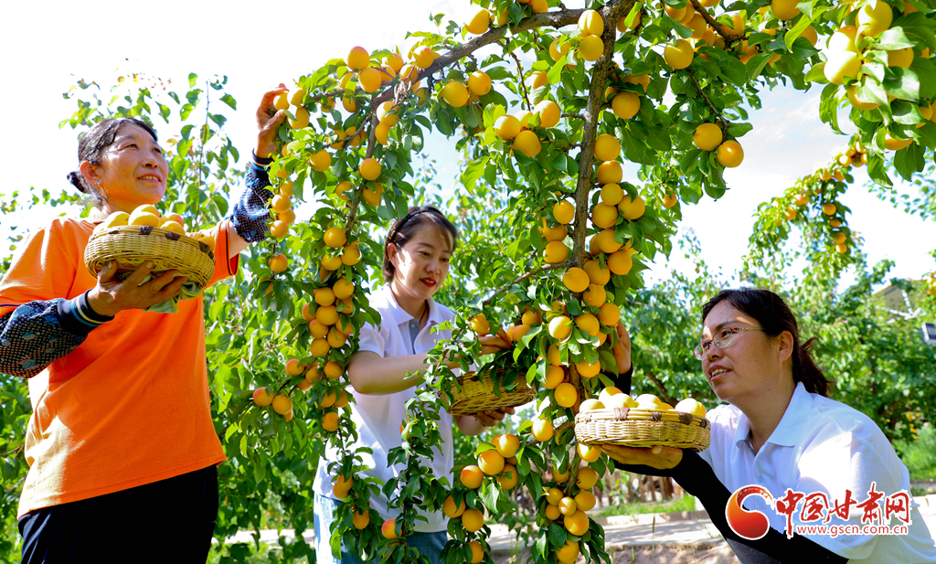 7月15日,甘肅省張掖市甘州區一專業合作社的特色林果種植基地內,金黃色的杏梅掛滿了枝頭,工作人員正在采摘成熟的杏梅。