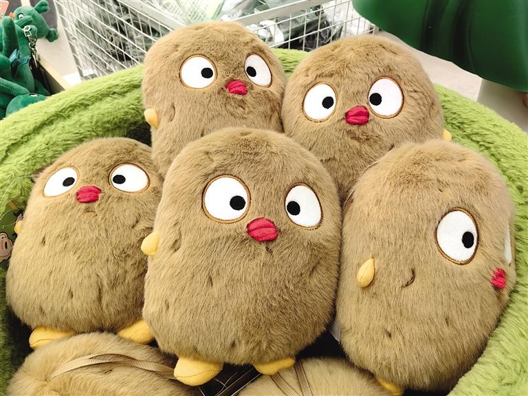 此時,目不暇接的花式文創在店內“爭奇斗艷”,爭當“顯眼包”,等待被主人帶回家。掀開店內一只毛絨收納箱,一窩土豆子撲閃著大眼睛向你眨眼。都說轉角遇到愛,誰料,轉角處粉嘟嘟的“拿捏玩偶娃娃公仔”捏著一個小蓮花花苞在向你招手。一回頭,造型別致的文創飾品精美又時尚,一側的帆布包上印著“別卷我”。就連記者逛下來,都入手兩件文創。