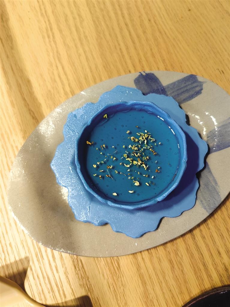 拿起一塊甜品,省博物館的鎮館之寶之一——“琉云璃彩”藍蓮盞近在眼前,“冰肌玉骨”的七瓣之蓮,顏色高貴的蓮花形托盞,果凍狀甜品上桂花飄香。你肯定想不到,這是一款通體可食的低糖蛋糕,它像夜幕下一朵綻放的藍蓮花,以奶油為原材料。在這里,顧客是可以“吃文物”的。