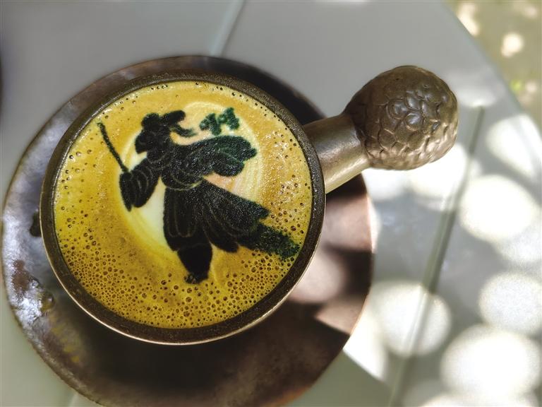 驚喜還有很多,就像店內柜體上的一句話“可以讓大家體會到我們不一樣的用心”,這些年輕人用心起來還真能撬動地球。飲品和咖啡,設計團隊愣是把口味和地域文化結合起來,整出了幾款“限量版”:城市限定——沙橙暴飲品,西北特有;特調咖啡——苦水玫瑰特調,讓人一口難忘之余還配上了臺詞,“苦水玫瑰有點甜”;“文物咖啡”更是占據“C位”,咖啡拉花機“印制”而成的微縮版銅奔馬、蛙紋罐、銅車馬等文物圖案浮在濃郁的咖啡上,精致、唯美。這還不算,咖啡器皿的名稱也非同尋常——鷹首權杖杯。陶瓷來自景德鎮,手柄是省博鷹頭形青銅權杖首的文物原型。驚嘆、贊美、感慨,每一位品嘗之人喜愛之余竟不忍飲用。