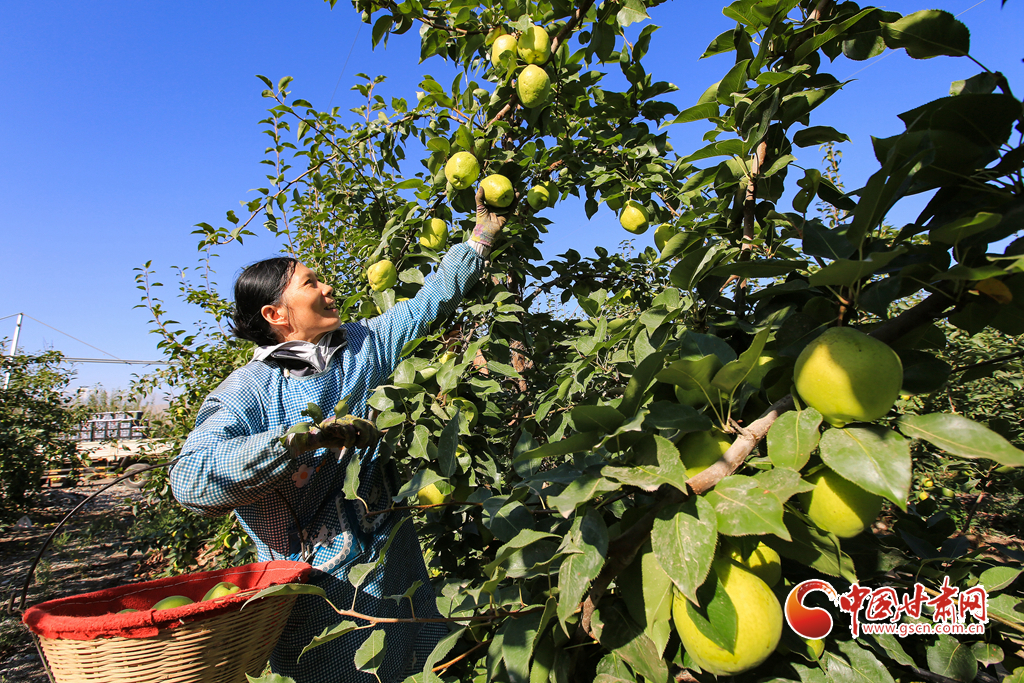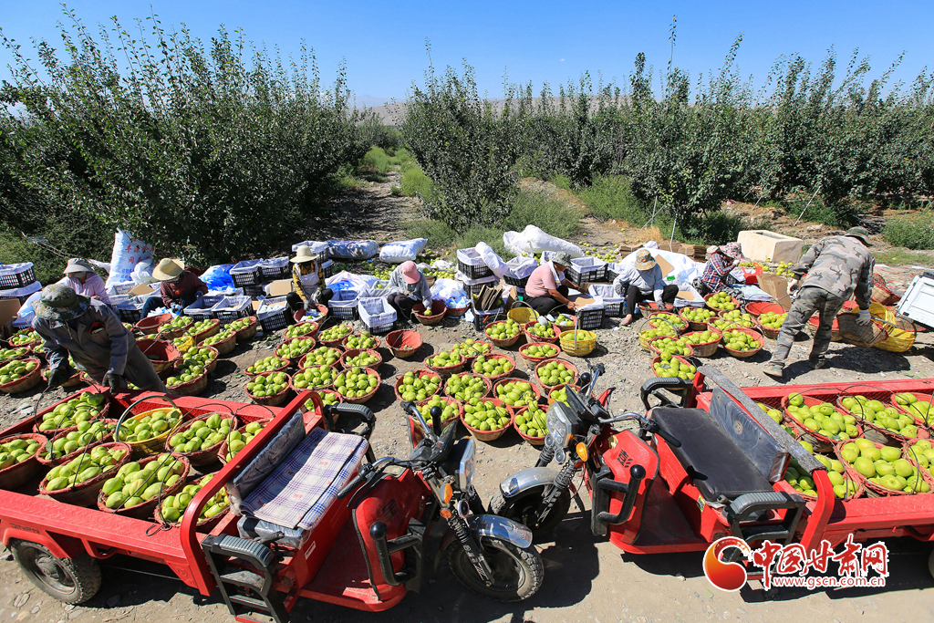 8月17日,位于祁連山下的甘肅省嘉峪關市文殊鎮(zhèn)豐源農業(yè)科技示范園1850余畝戈壁早酥梨喜獲豐收,果農們正忙著采摘、分揀、裝箱、儲存。