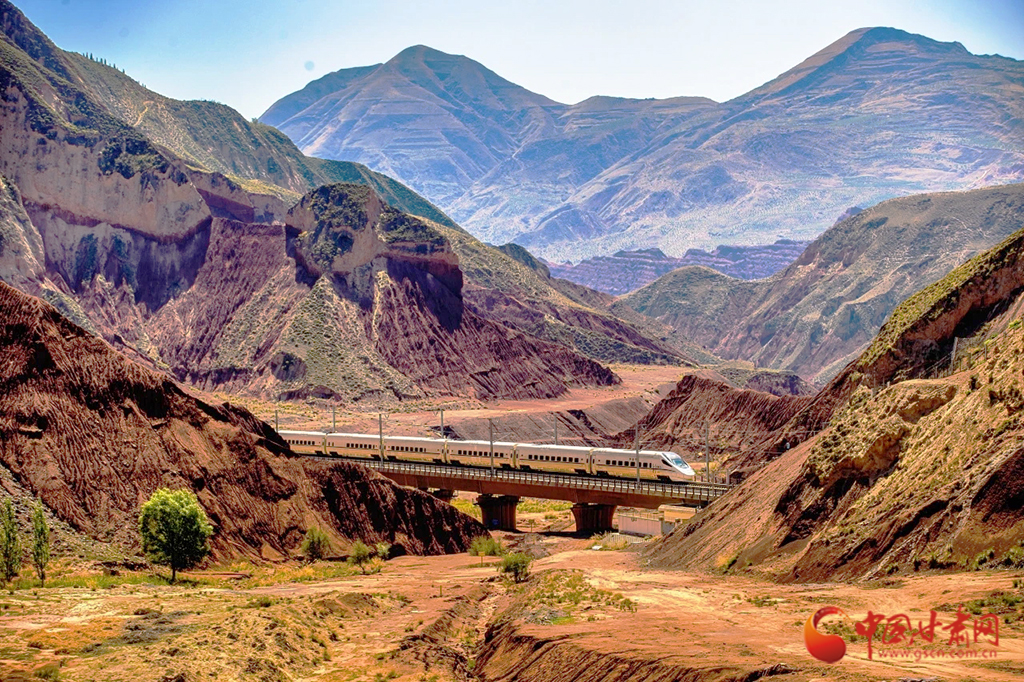 朝家山隧道位于蘭州市紅古區(qū)和青海省民和縣交界處,是蘭新高鐵西出蘭州必經(jīng)之地。在這里,通體呈紅色的丹霞地貌在湛藍天空下越發(fā)顯得艷麗奪目,列車穿越七彩丹霞,風(fēng)景如畫風(fēng)光無限好。