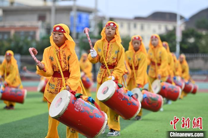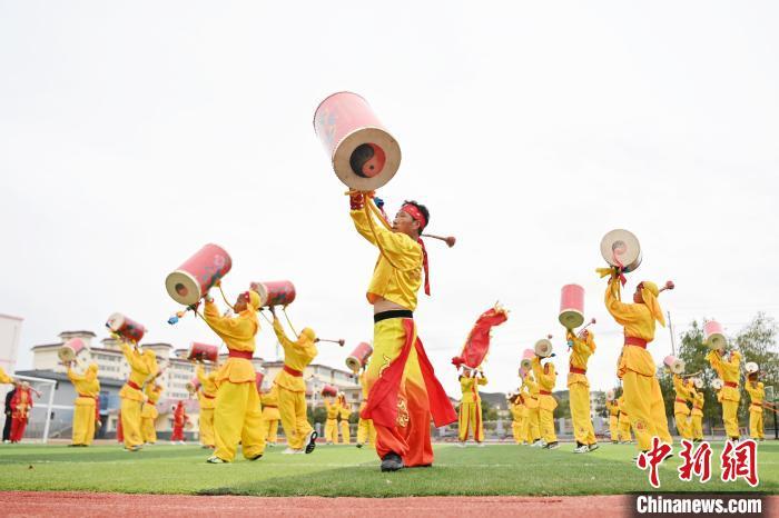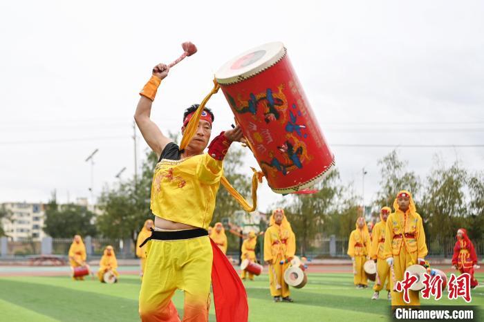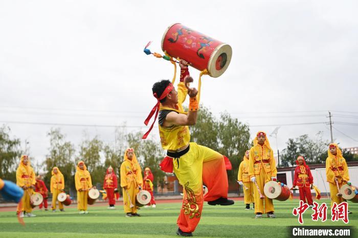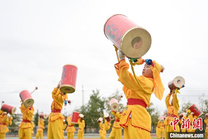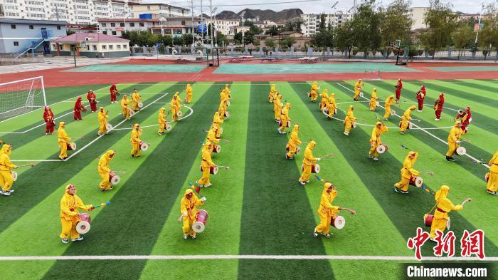 9月9日,甘肅省蘭州市皋蘭縣三川口學校學生練習蘭州太平鼓。近年來,皋蘭縣將國家級非物質文化遺產蘭州太平鼓納入各中小學課后服務內容,成立中小學太平鼓隊13支,定期邀請非遺傳承人走進校園,進行傳統文化授課和培訓,使學生親身感受中華優秀傳統文化的魅力。蘭州太平鼓舞已有六百余年的歷史,素有“天下第一鼓”之稱,2006年被列入中國第一批非物質文化遺產名錄。中新社記者 九美旦增 攝