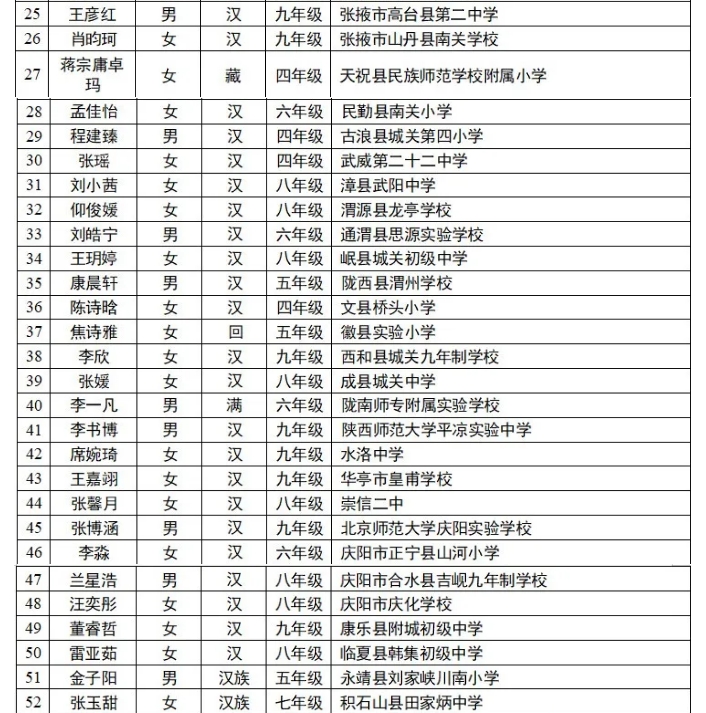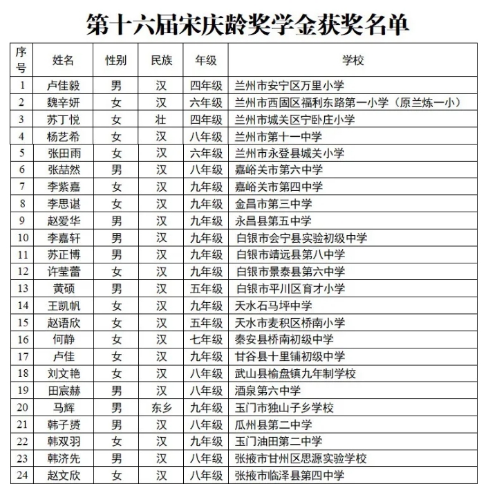 日前,經地方各級教育行政部門推薦,第十六屆宋慶齡獎學金獲獎名單公布,全國共有1542名學生獲獎,其中甘肅56人。