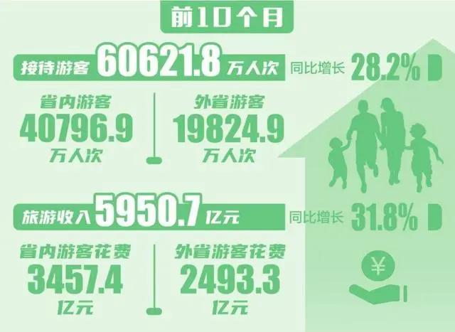 剛剛出爐的遼寧省旅游市場數據顯示:今年1月至10月,遼寧省接待游客60621.8萬人次,同比增長28.2%;旅游收入5950.7億元,同比增長31.8%。其中,10月全省接待游客9255.7萬人次,同比增長5.7%;旅游收入692.7億元,同比增長8.8%。
