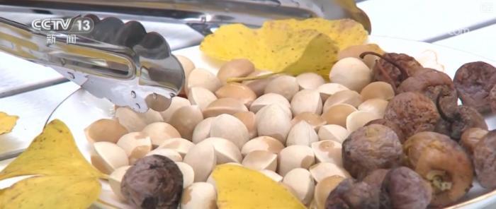 身在銀杏村,這里的鄉親們也是開發研制出了很多既安全又美味,還能發揮銀杏果“藥食兩用”特性的特色美食。村子里最常見的,是用炭火慢慢翻炒出的干果。還有將銀杏果、松子、核桃和芝麻等食材混合炒熟,再用木錘使勁敲平制成的銀杏酥,味道也是油潤香甜。