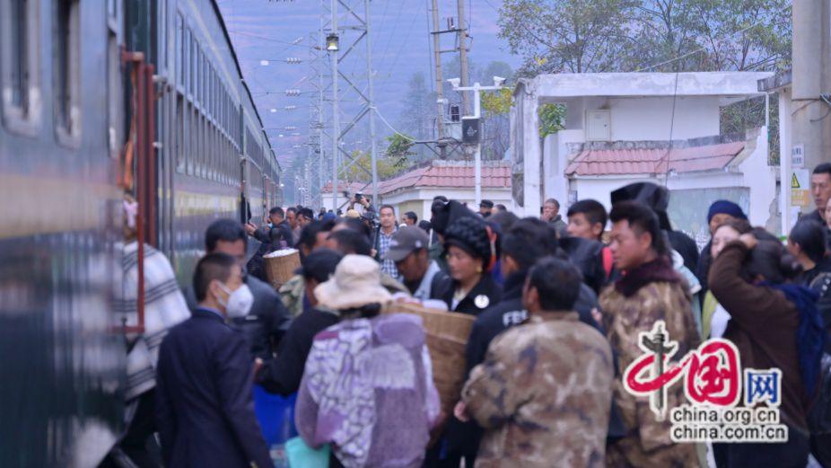 2024年11月20日,彝歷新年第一天,成昆線5633次慢火車停靠在站臺,彝族同胞有序乘車。原波 攝