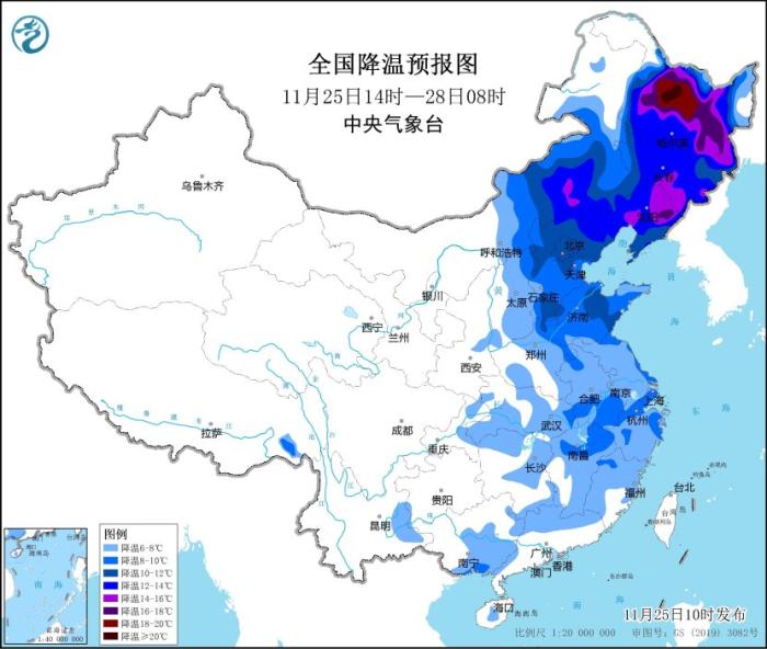 預計,11月25日14時至11月27日14時,內蒙古中東部、華北、東北地區中南部、黃淮、江淮、江漢東部、江南北部等地將先后降溫6~10℃,其中,內蒙古中部、華北北部、東北地區中南部等地部分地區降溫可達12℃以上。