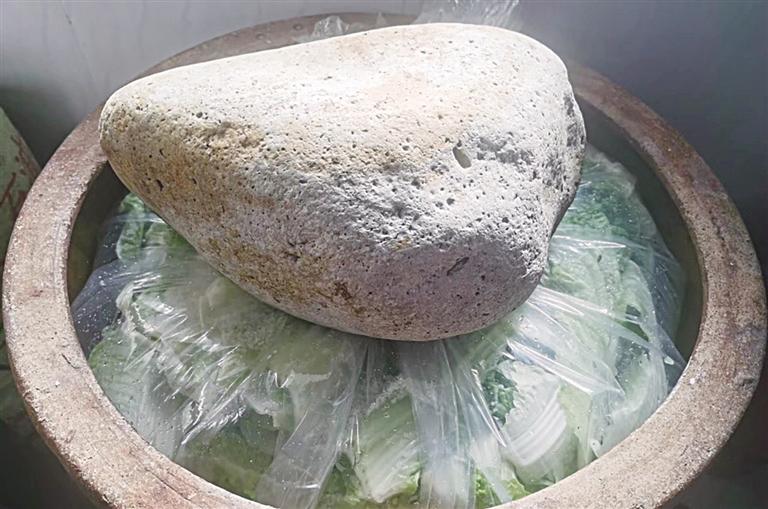 交談中,菜市場爺爺奶奶輩的老人說,除了囤好大白菜,“一口酸菜缸,一塊腌酸菜用的大石頭”也必不可少。“前一年缸里的菜吃完后,要把空缸倒扣在地面上,接上地氣,除去缸中的異味,然后洗干凈,晾干,來年再用。”老人家說,傳統的近半人高的醬色大缸一般都是家里的老人留下來的,那時候大家的生活條件不好,一家人的美食,都被腌制在壇壇罐罐里,甚至搬家都舍不得丟棄這口缸。腌菜用的壓菜石也是有講究的,先要夠分量,太小了壓不實,太大了不方便取菜,也有人常常用幾塊卵石同時壓菜的辦法來解決;最好還要表面光滑、不扎手、好清洗,“基本都是黃河邊撿的石頭拿回去洗干凈用”。