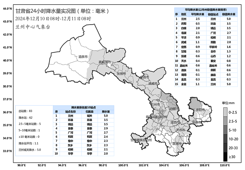 中國甘肅網(wǎng)12月11日訊(西北角·中國甘肅網(wǎng)記者 沈文剛)12月10日8時至12月11日8時,全省共計62個縣區(qū)出現(xiàn)小雪,其中蘭州主城區(qū)出現(xiàn)大雪,慶陽北部、白銀中部和北部、臨夏西南部出現(xiàn)中雪。較大降水量出現(xiàn)在蘭州本站5.0mm、靖遠3.5mm、環(huán)縣3.5mm、景泰2.9mm、廣河2.7mm。
