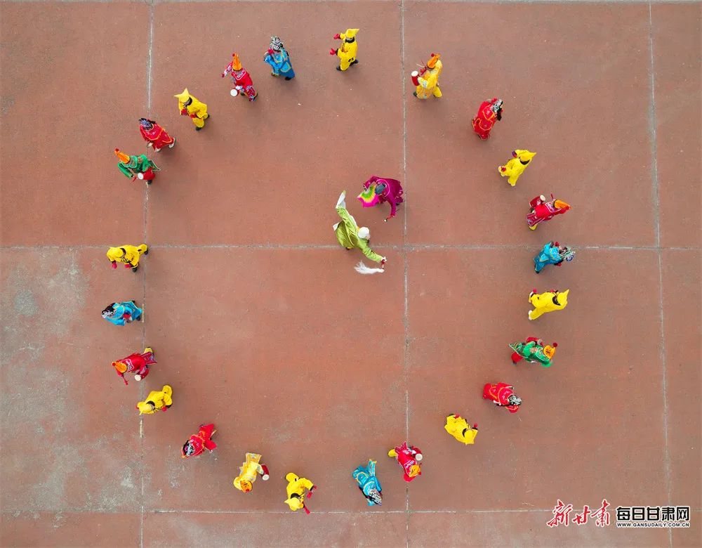 嘉峪關(guān)市文化館組織當(dāng)?shù)胤沁z地蹦子表演者排練,為2025年春節(jié)社火展演作準(zhǔn)備。新甘肅·每日甘肅網(wǎng)通訊員 馬百旺