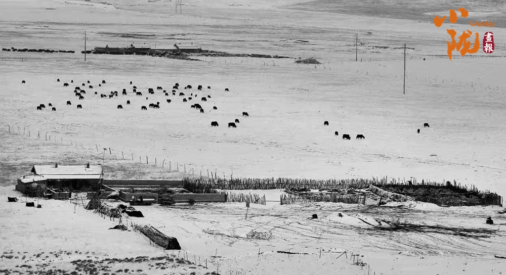 天空陰沉,雪花依舊飄落,分散在雪地中的牦牛群,悠然自得地啃食著牧草,寒冷的天氣仿佛對它們毫無影響。