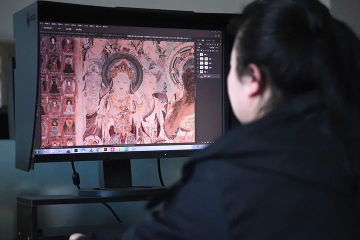 2023年4月25日,敦煌研究院文物數(shù)字化保護(hù)團(tuán)隊圖像處理人員年海麗在拼接壁畫圖像。新華社記者 陳斌 攝
