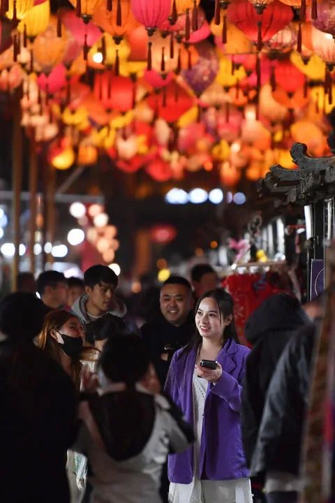 2023年3月16日,游客在敦煌夜市游覽。新華社記者 陳斌 攝