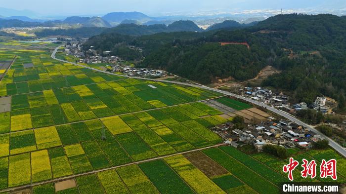 近日,云南省騰沖市界頭鎮成片的油菜花盛開,吸引不少游客前來觀光。金黃的油菜花海與遠處白墻黛瓦的村落相映成趣,共同繪就一幅寫意的水墨畫。圖為油菜花田航拍。趙輝 攝