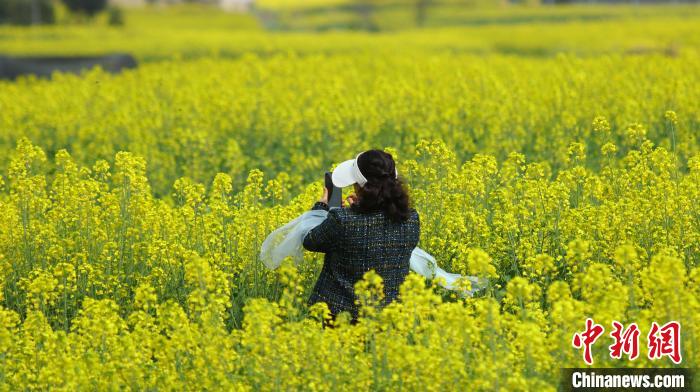 近日,云南省騰沖市界頭鎮成片的油菜花盛開,吸引不少游客前來觀光。金黃的油菜花海與遠處白墻黛瓦的村落相映成趣,共同繪就一幅寫意的水墨畫。圖為游客拍攝油菜花田。趙輝 攝