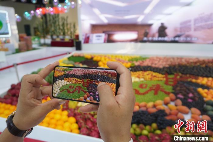 2022年7月10日,第二十八屆中國蘭州投資貿易洽談會展區展示甘肅地方特色產品。圖為參觀者手機拍攝用農產品拼裝的“甘味”。(資料圖)九美旦增 攝