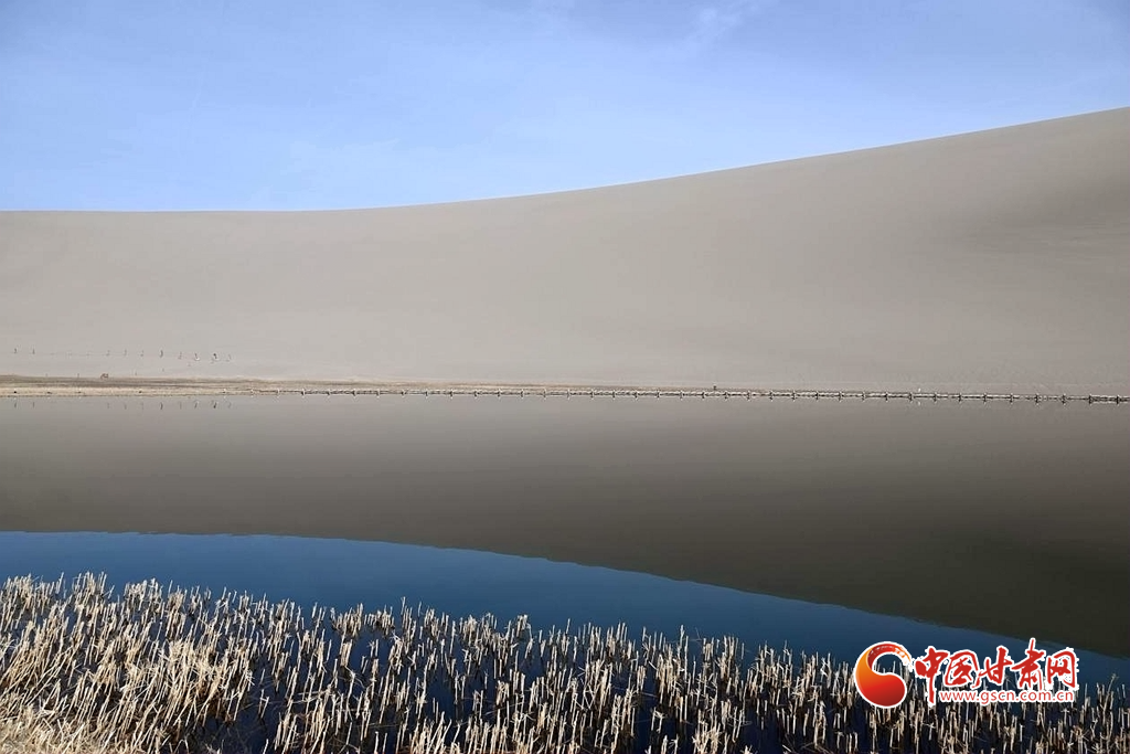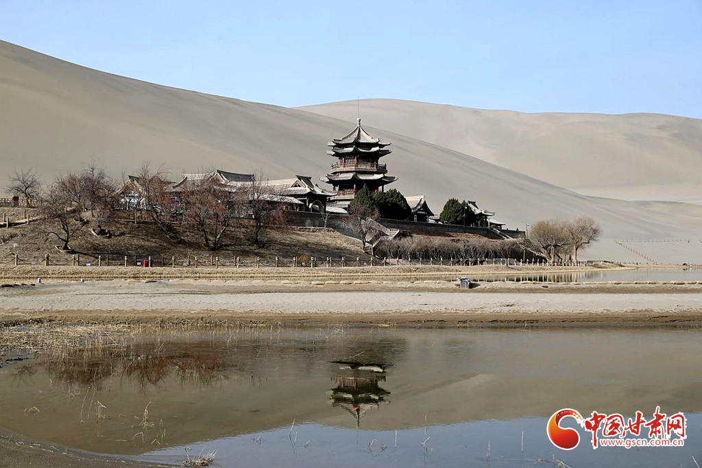 3月8日,隨著氣溫回暖,絲路明珠敦煌迎來早春勝景。鳴沙山環抱中的月牙泉冰雪消融,一泓碧水宛如翡翠鑲嵌在大漠之中,呈現出"沙水共生"的奇觀。