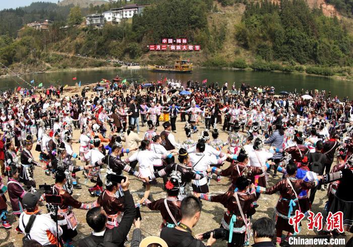 2024年3月11日,在廣西三江侗族自治縣梅林鄉,“二月二”侗族大歌節活動吸引游客前來體驗侗鄉風情。圖為民眾在跳多耶舞。 吳練勛 攝